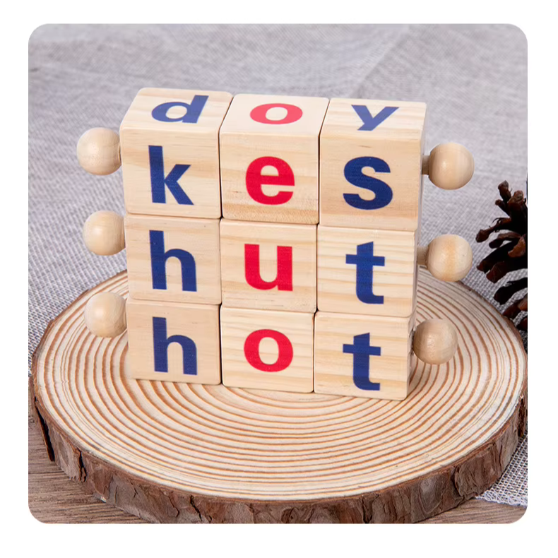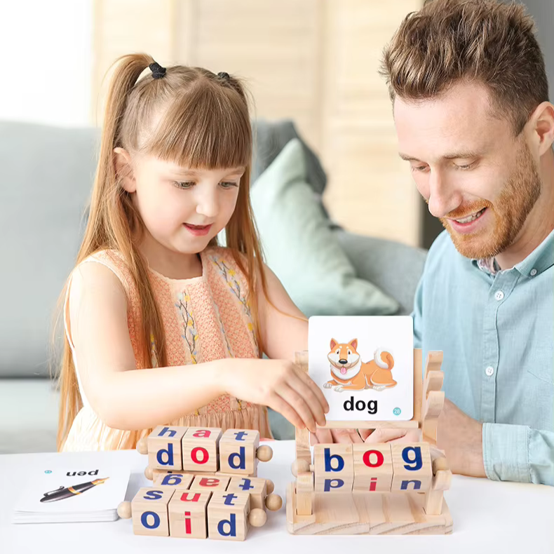 Choose a card, pick a set of blocks, and spin until you match what’s shown and written on the board. This child-friendly setup allows kids to explore, make mistakes, correct themselves, and actually understand spelling, not just memorize it.
